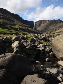 De retour à Eglysstadir, nous nous dirigeons vers la cascade de Hengifoss, une des plus hautes du pays. Elle se mérite: 400 m de dénivelé et 45 mn de marche.L'avantage en Islande, on peut commencer une balade en milieu d'après midi sans crainte d'être rattrapé par la nuit !